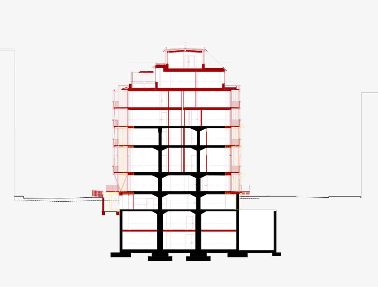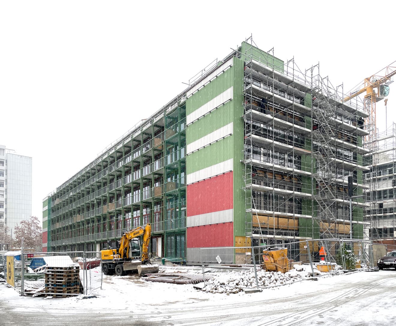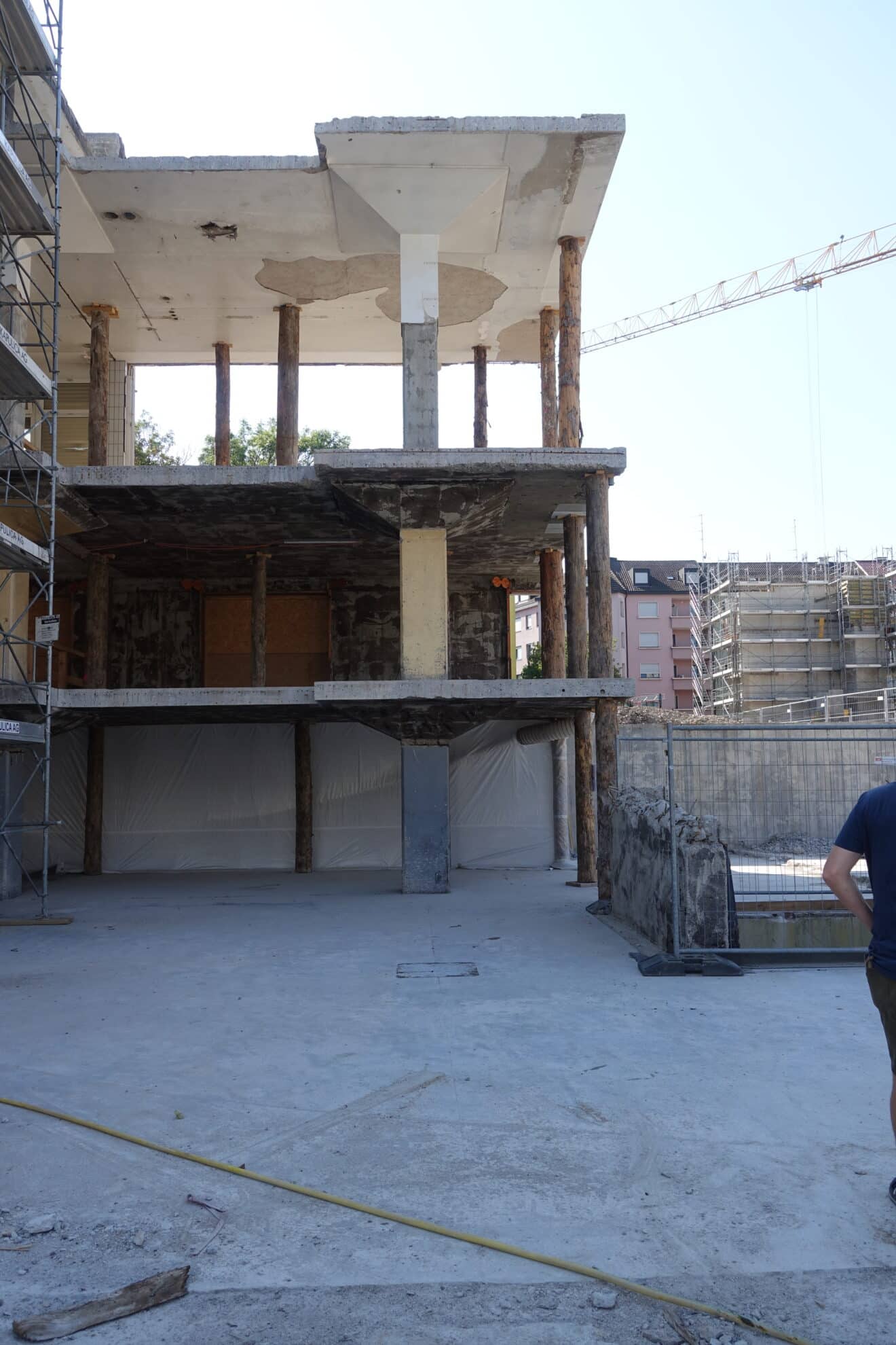 Das ehemalige Weinlager wurde bis auf den Rohbau zurückgebaut. Auch die beiden Stahlbaugeschosse aus den 70er-Jahren mussten weichen, weil sie zu hoch waren um der Zone 5a und einer Gebäudehöhe von 18 Meter zu entsprechen und sich die Stiftung nicht den Bestandsschutz in Anspruch nehmen wollte. Wer während dieser Bauphase einen Blick auf den freigesetzten Rohbau erhaschen konnte, fühlte sich an die schönen Strukturmodelle in der Studienzeit erinnert. Gleichzeitig stellt sich die Frage der Verhältnismässigkeit – in diesem Moment schien mir das gewählte Vorgehen sehr «romantisch». Sieht man nun aber kurz vor der Fertigstellung, was diese Struktur räumlich leistet und welche industrielle Identität sie den Wohnungen bringt, so ist die Erhaltung nicht nur für den Grauenergiewert, sondern auch für das architektonische Bauwerk ganz zentral. Mittels eines Massivbaus wird im Projekt von Esch Sintzel die Bestandsstruktur wiederum um zwei niedrige Geschosse erhöht und erhält zusätzlich zwei Attikageschosse. Letzteres ist baurechtlich möglich, weil es zu keiner Verschattung der umliegenden Häuser führt. Um die Bestandstruktur auszusteifen erhält das Weinlager seitlich «zwei massive Buchstützen» die sich auch in den Fassaden abzeichnen. Dazwischen werden auf der Nord- und Südseite Balkonschichten vorgestellt, welche durch ihre Filigranität auffallen und für den Ausdruck prägend sind.