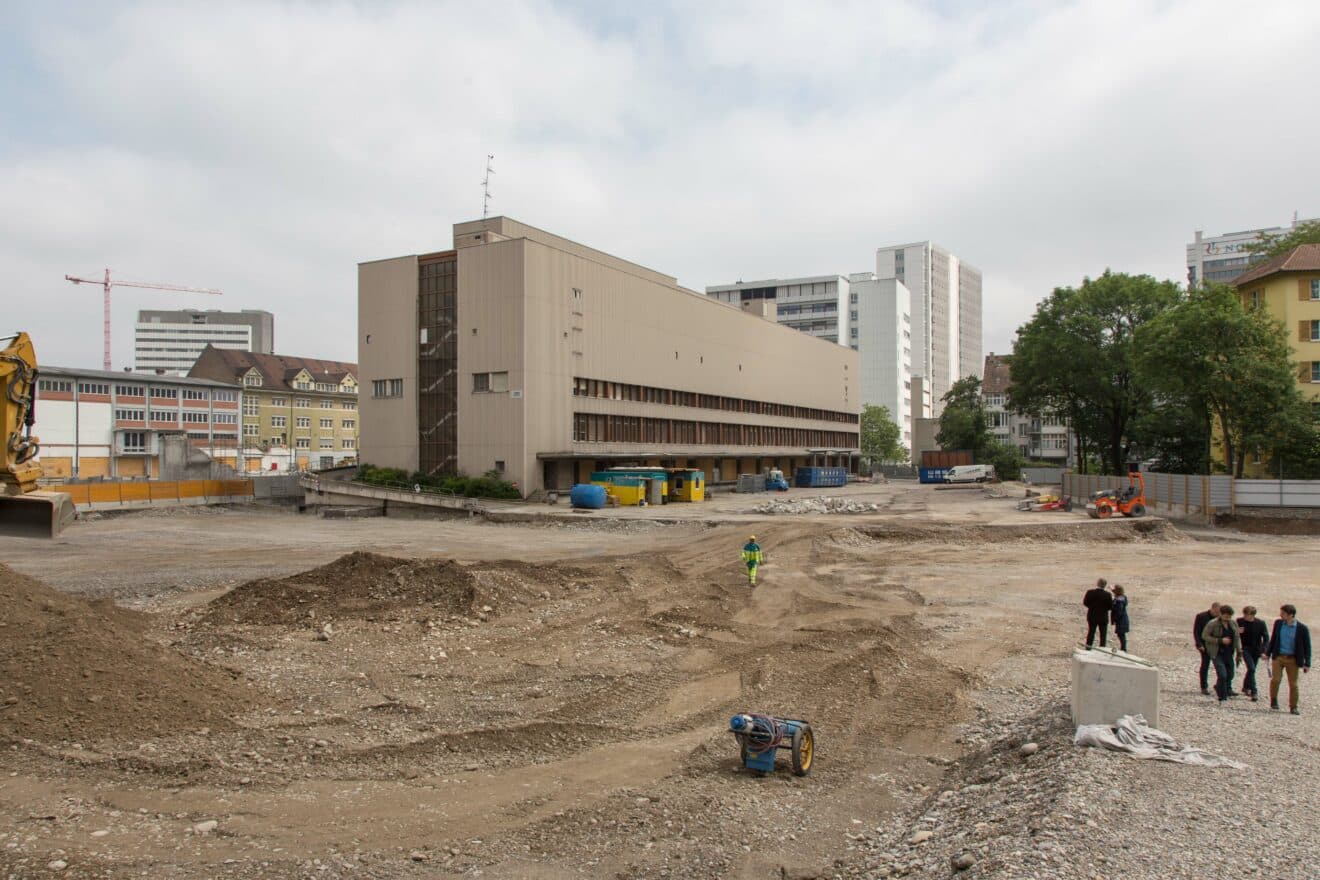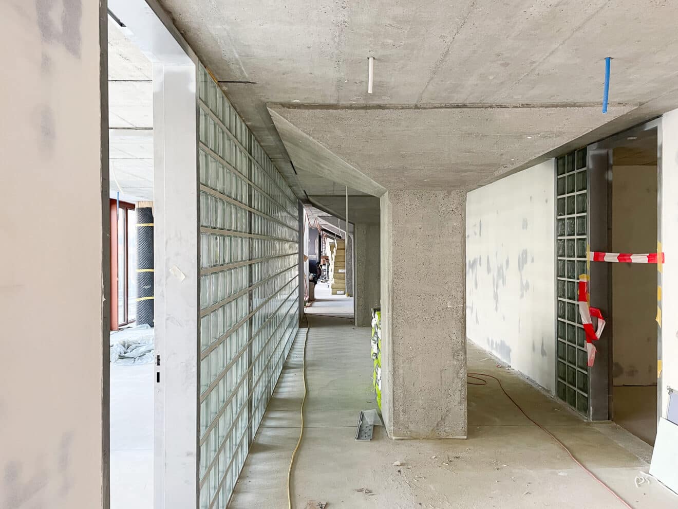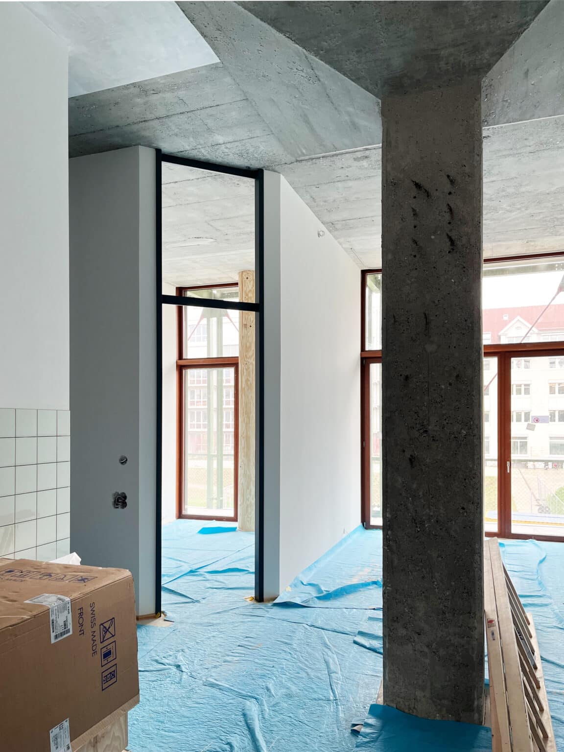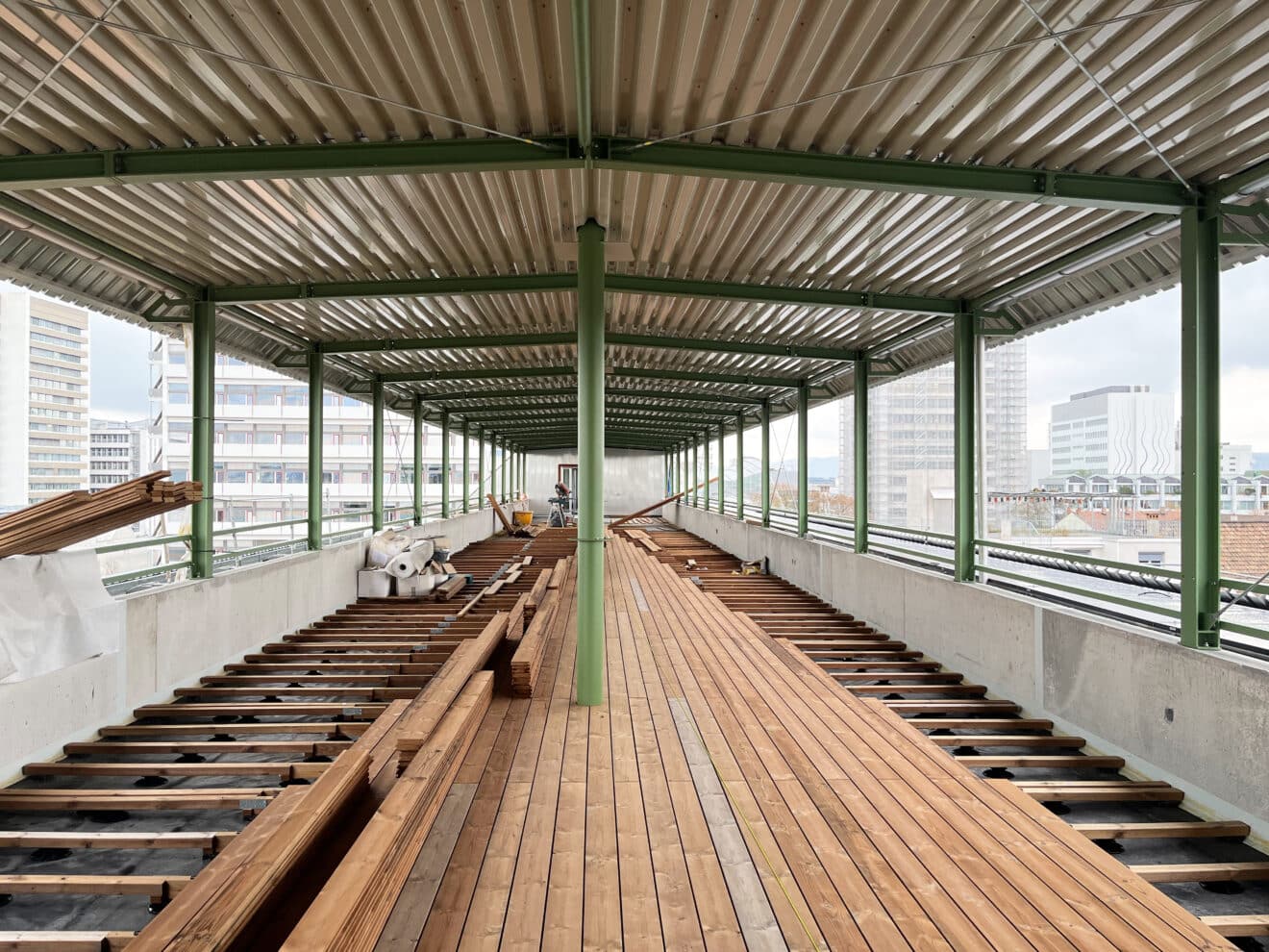 Das ehemalige Weinlager wurde bis auf den Rohbau zurückgebaut. Auch die beiden Stahlbaugeschosse aus den 70er-Jahren mussten weichen, weil sie zu hoch waren um der Zone 5a und einer Gebäudehöhe von 18 Meter zu entsprechen und sich die Stiftung nicht den Bestandsschutz in Anspruch nehmen wollte. Wer während dieser Bauphase einen Blick auf den freigesetzten Rohbau erhaschen konnte, fühlte sich an die schönen Strukturmodelle in der Studienzeit erinnert. Gleichzeitig stellt sich die Frage der Verhältnismässigkeit – in diesem Moment schien mir das gewählte Vorgehen sehr «romantisch». Sieht man nun aber kurz vor der Fertigstellung, was diese Struktur räumlich leistet und welche industrielle Identität sie den Wohnungen bringt, so ist die Erhaltung nicht nur für den Grauenergiewert, sondern auch für das architektonische Bauwerk ganz zentral. Mittels eines Massivbaus wird im Projekt von Esch Sintzel die Bestandsstruktur wiederum um zwei niedrige Geschosse erhöht und erhält zusätzlich zwei Attikageschosse. Letzteres ist baurechtlich möglich, weil es zu keiner Verschattung der umliegenden Häuser führt. Um die Bestandstruktur auszusteifen erhält das Weinlager seitlich «zwei massive Buchstützen» die sich auch in den Fassaden abzeichnen. Dazwischen werden auf der Nord- und Südseite Balkonschichten vorgestellt, welche durch ihre Filigranität auffallen und für den Ausdruck prägend sind.