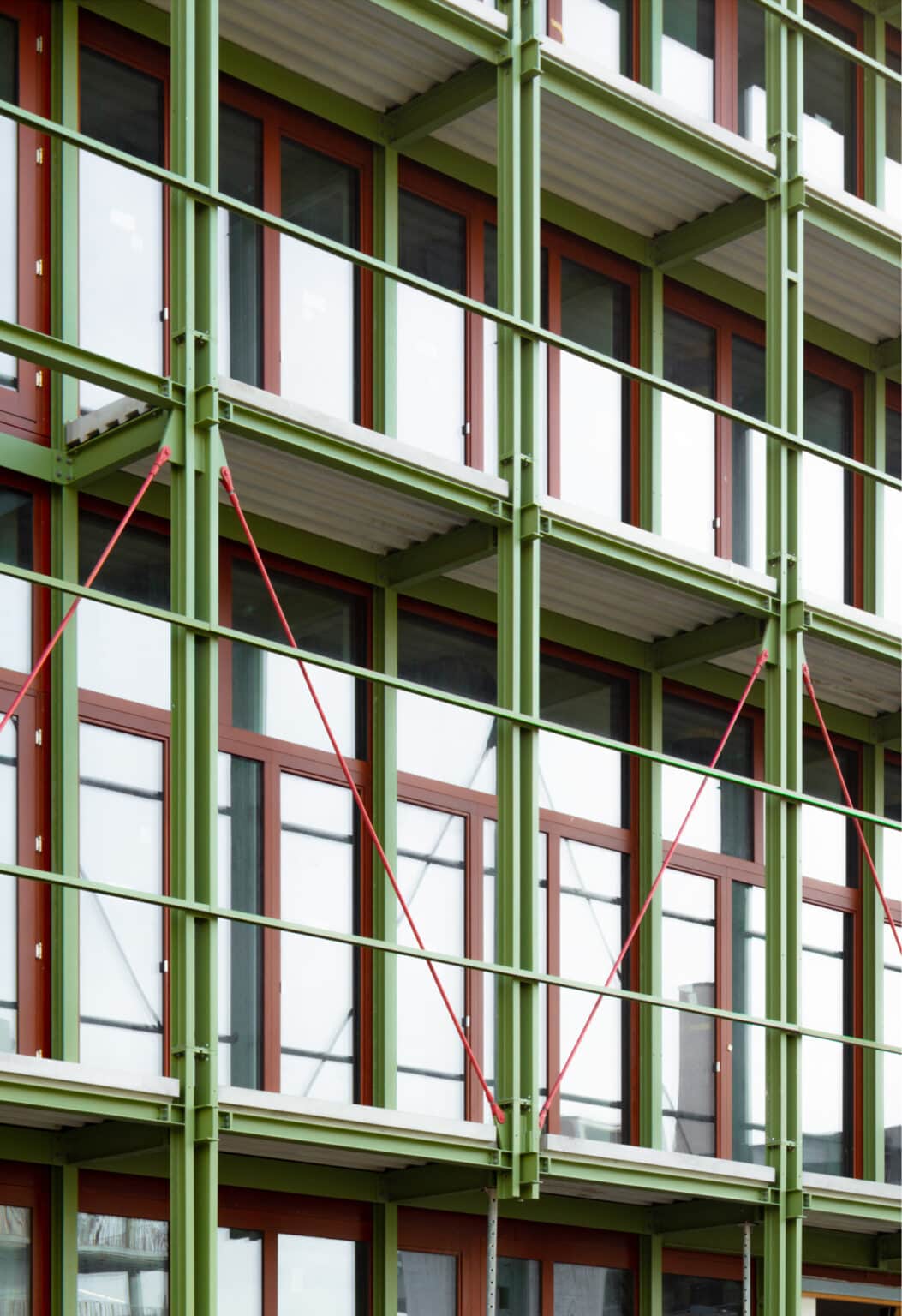 Für die Fassadenverkleidung wurden handelsübliche Trapezbleche verwendet. Einerseits, um an der Geschichte des Baus aus den 70er Jahren weiterzuschreiben, anderseits zur Erhaltung der ästhetischen Identität. Die Standardbleche werden jedoch umgekehrt angebracht. Damit ändert sich das Verhältnis. Die eigentliche Nut sieht nun aus wie eine Deckleiste, wie wir sie von klassischen Holzfassaden kennen. Stirnseitig, im Bereich der Fenster wird die Fassadenverkleidung aufgeklappt. Marco Rickenbacher beschreibt die Absicht als ähnlich dem «Öffnen einer Aluminiumdose». Die als Stahlbau konstruierten Balkonschichten sind als selbsttragende Konstruktion beidseitig vor das eigentliche Gebäude gestellt. Durch den Abstand von 1.5 cm konnte die Anschlussabdichtung eingespart werden. Die Balkonplatten, in Trapezbleche gegossenen Betonfertigteile, konnten dank dem Blech elegant gefertigt werden.
