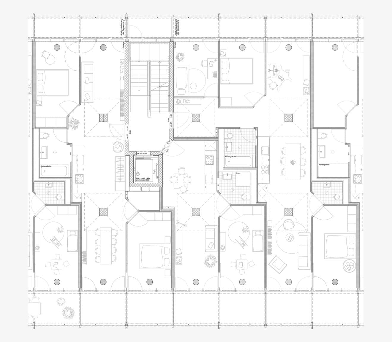 Im ersten und zweiten Obergeschoss sind die Treppenhäuser, die von der Rue Interieur im Erdgeschoss erschlossen werden, jeweils als Dreispänner angelegt. Die eindrucksvollen Pilzstützen werden in den Wohnungen freigespielt und sorgen für die räumliche Ordnung. Sie zonieren auf eine charmante Weise die durchgestreckten Wohn- und Essräume in drei adäquate Bereiche und heben das Schlauchige und wenig Behagliche, das dieser Durchwohn-Typus sonst oftmals mit sich bringt, komplett auf.