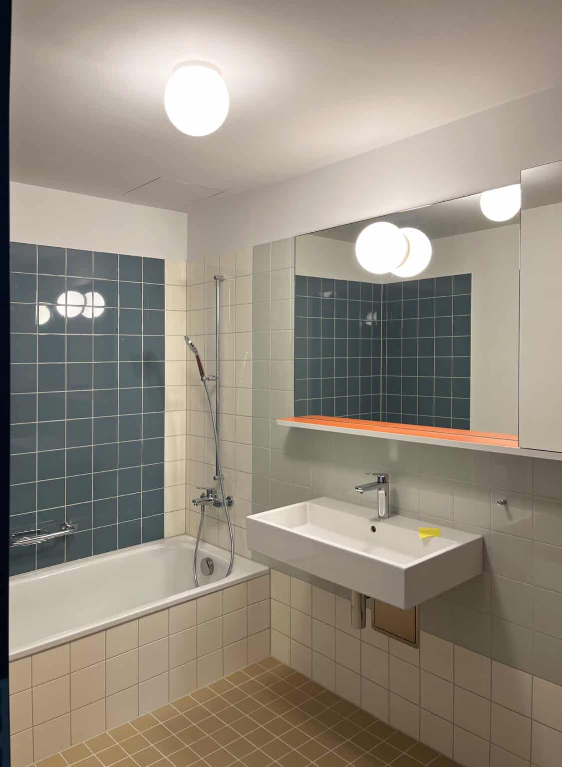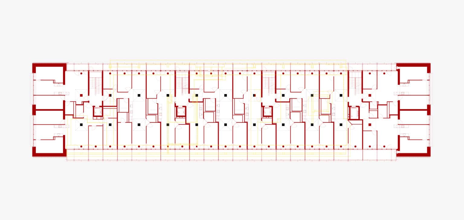 Vielseitiges Programm und lustvolle Typologie Im Haus befinden sich insgesamt 64 Mietwohnungen mit einem Raumangebot von 1.5 bis 7.5 Zimmern. Es entsteht ein neuer Wohnhaus-Massstab für Basel. Den zukünftigen Bewohnern wird à la Corbusiers Unité einiges geboten: Einen Gemeinschaftsraum, eine gemeinschaftliche Dachterrasse, die an ein Schiffsdeck erinnert, die zu geselligen Abenden über den Dächern einlädt, sowie Gästezimmer und sogenannte «chambre d’amis». Dazu kommen öffentliche Nutzungen wie Gewerberäume, eine Café-Bar und sieben Musikproberäume. Laut den Architekten ist noch wichtiger als alle gemeinschaftlichen Raumangebote die Aktivität und das Begegnen im Haus sowie eine angenehme Grosszügigkeit und Lichtstimmung in diesen Bereichen. In der Rue Interieur im Erdgeschoss erreichen sie dies beispielsweise durch Trennwände aus Glasbausteinen zu den gemeinschaftlichen Waschsalons.