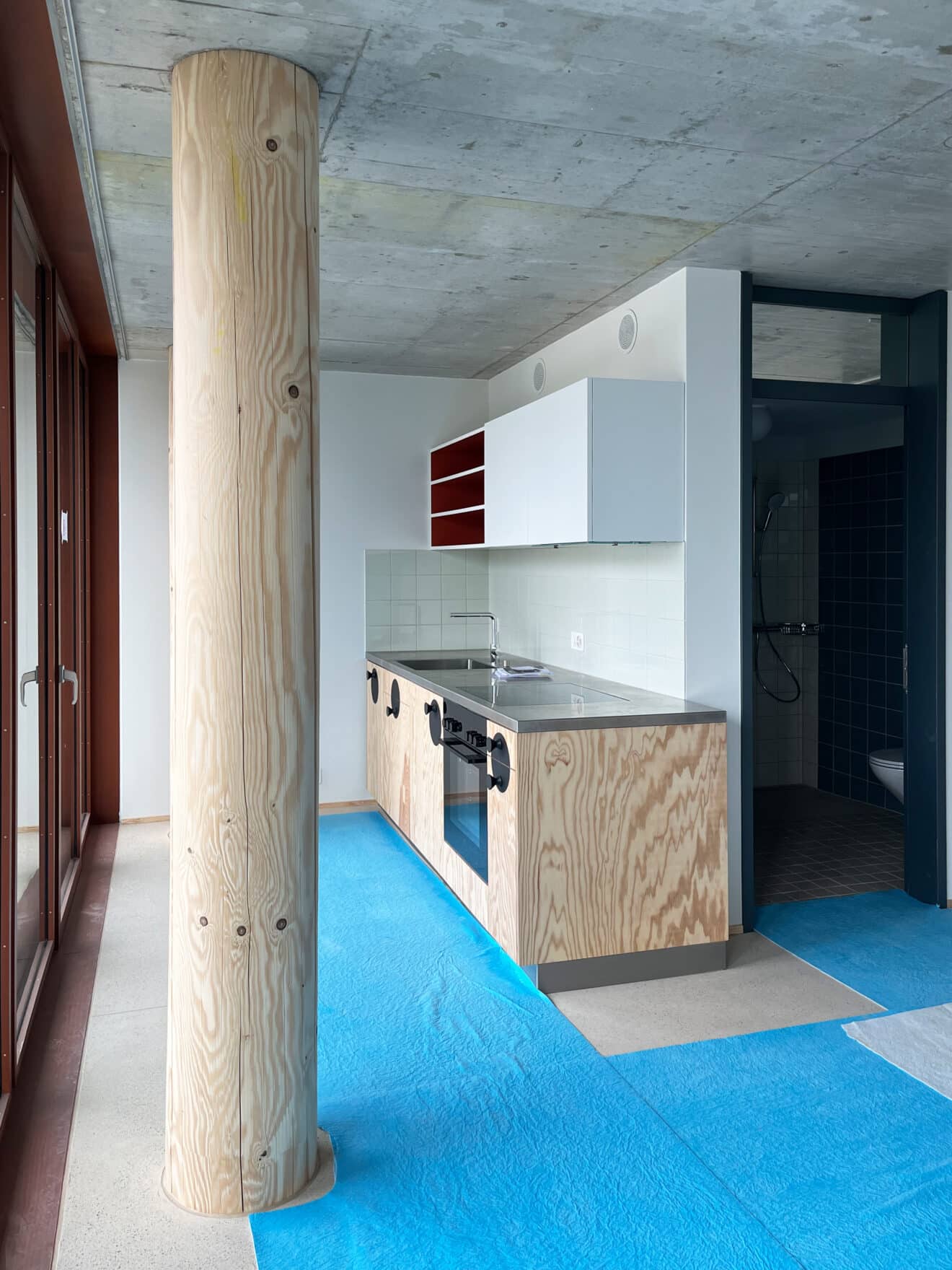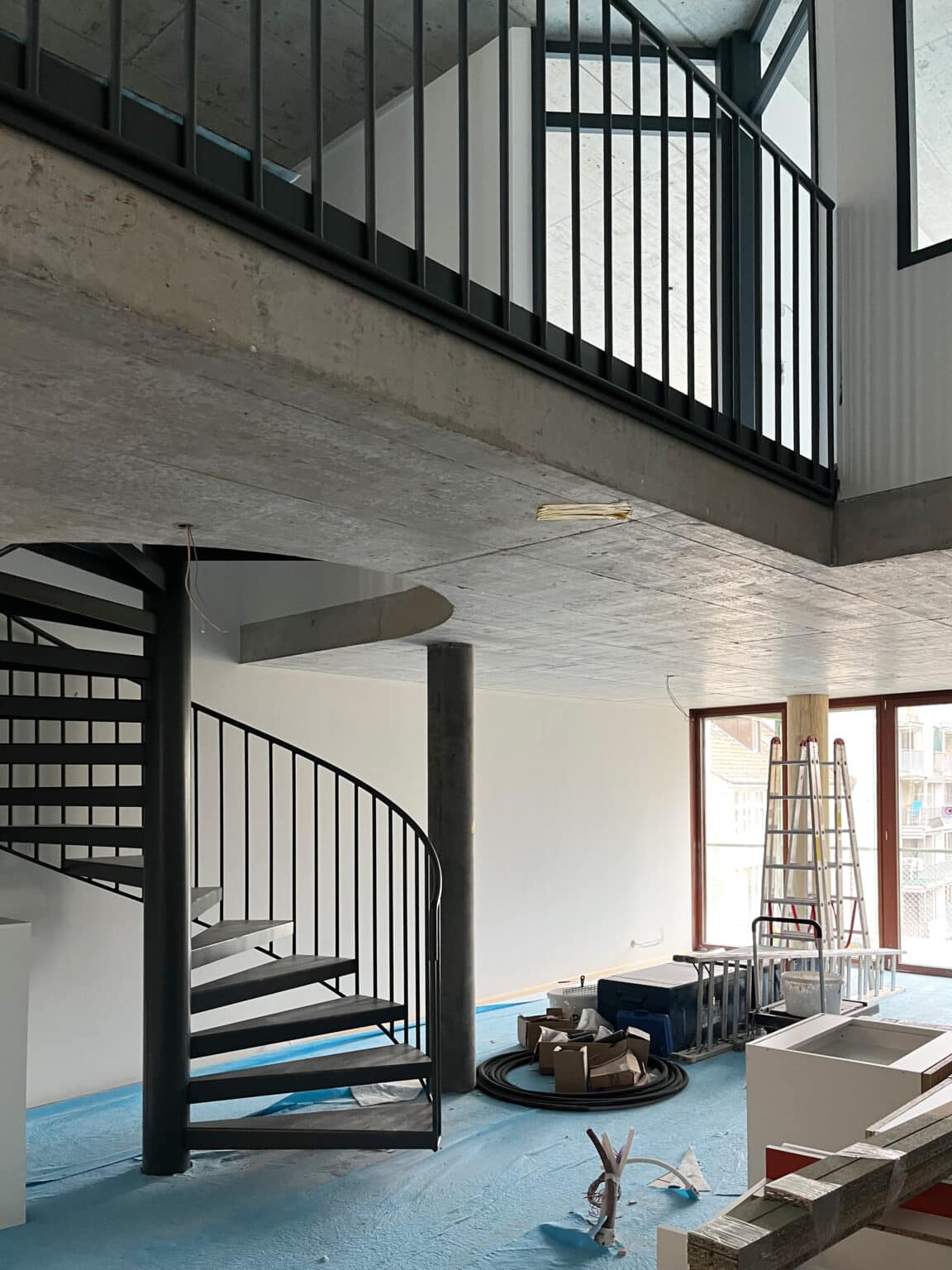 Anders als andere Wettbewerbsteilnehmer bieten Esch Sintzel die zweistöckigen Maisonette-Wohnungen nur in der neu erstellten Aufstockung an. Dies ist ein geschickter Schachzug. Dadurch werden die Aussparungen und Durchdringungen durch interne Treppen oder Lufträume in den bestehenden Betondecken minimiert und sie können ganz selbstverständlich und grosszügig, ohne statische Strapazen im neuen Gebäudeteil angeboten werden.