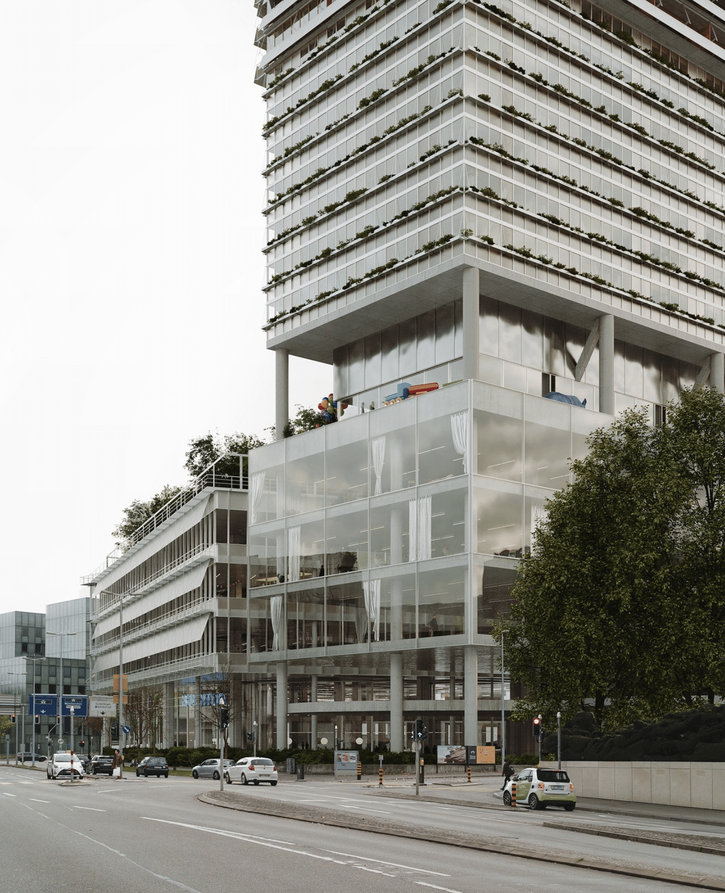 Die Strukturierung durch eine grosse Galerie und die Freistellung eines der drei Hochhäuser ermögliche es zudem, dass das Projekt in Etappen realisiert werden könne. Auch bezüglich Nachhaltigkeit konnte die Projektstudie überzeugen. So bleibt etwa ein grosser Teil der heutigen Gebäudestruktur erhalten.