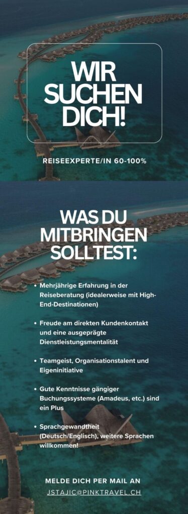 Pink Travel AG: Wir bereisen regelmäßig unsere Hauptdestinationen sowie Hotels und können unseren Kundinnen und Kunden dadurch Empfehlungen und Informationen aus erster Hand bieten.
